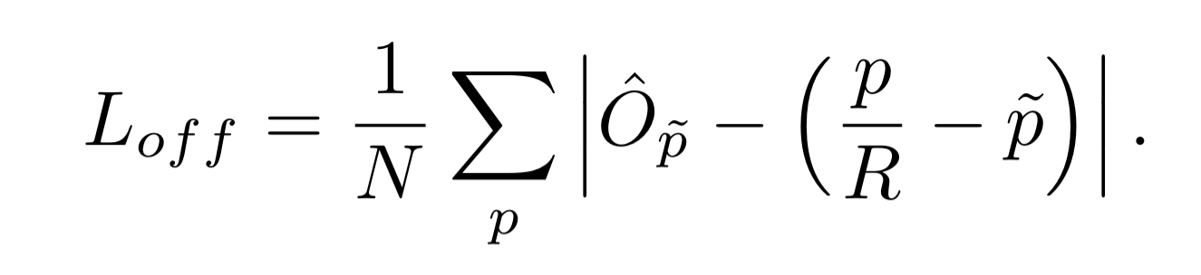 p는 input image scale에서 object center의 x 또는 y 좌표 이고 $\tilde{p}$ 는 소수를 버림한 $\frac{p}{R}$ 값이다.