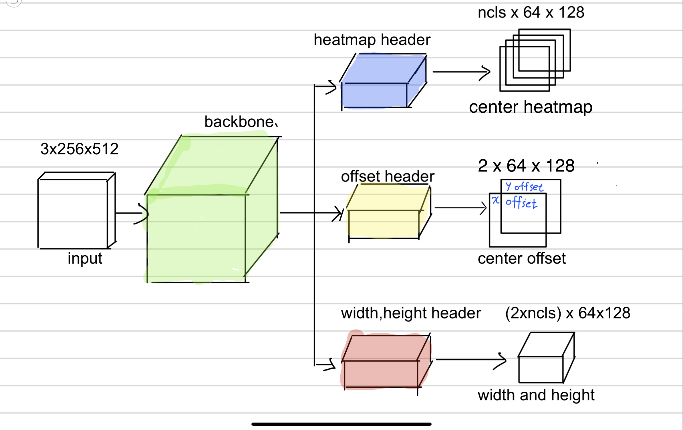 (그림에서 center heatmap 위의 ncls x 64 X128은 출력 텐서의 모양이고 ncls는 number of classes의 약자이다.) - center offset은 output stride때문에 발생하는 discretization error를 보상하기 위해 추정하는 것으로 각 object center 위치를