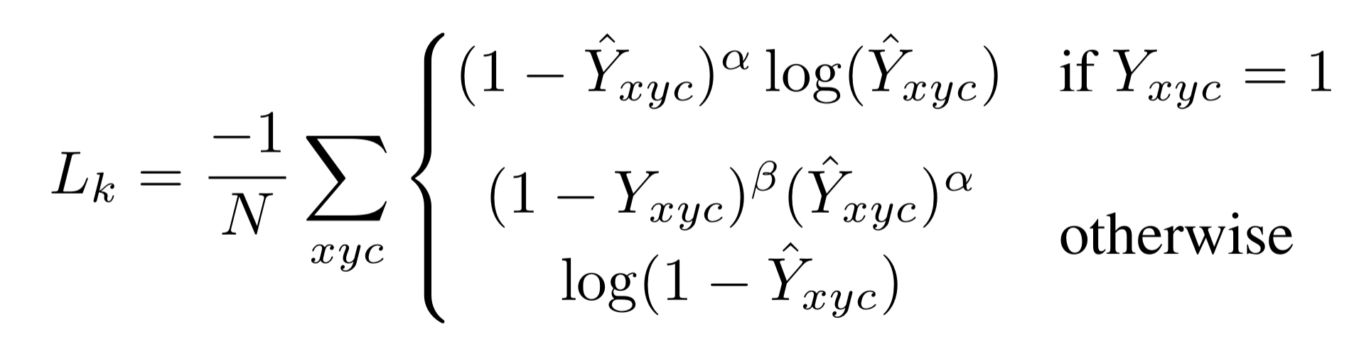 $Y_{xyc}$=1은 object center 위치의 GT 값이다. 학습 초반 $\hat{Y}_{xyc}$의 값이 작다면 $(1-\hat{Y}_{xyc})^{\alpha}$ 의 값이 상대적으로 커서 loss 가 커지고 학습 후반으로 갈록 $\hat{Y}_{xyc}$의 값이 0에 가까워 지면 $(1-\hat{Y}_{xyc})^{\alpha}$ 의 값이 기하 급수적으로 작아져 loss에 거의 영향을 미치지 않는다.