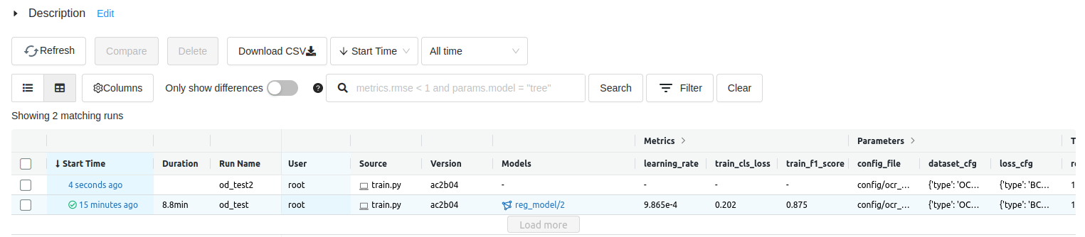 Fig 1.의 중앙 부분은 object detection 테스크 하위에서 실행 된 run을 보여주는데 Run Name 이라는 섹션에 보면 od_test, od_test2 라는 이름의 run들이 실행 된 것을 볼수 있다. 행 별로 각 run 에서 로깅된 metric, parameter 등을 확인 할 수 있다.