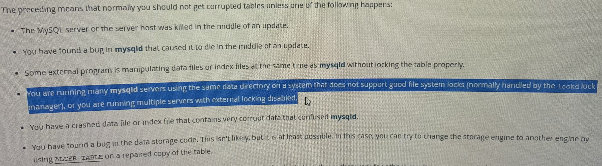 원인을 찾기 위해 Fig 2 error log를 분석하던 도중 'there may be corruption in the InnoDB tablespace.' 라는 문구가 눈에 띄었고 검색을 하며 찾던 중 Fig 3 와 같은 단서를 찾았다.