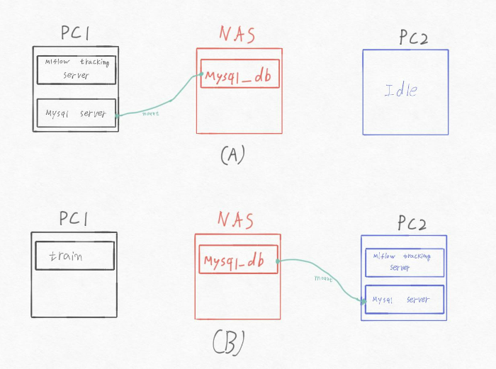 그러던 중 놀고 있는 pc2를 발견하고 pc2에 mlflow tracking server와 mysql server를 운영 하면 내 주pc 인 pc1은 한결 가볍게(필요할때 재부팅 등) 사용 할 수 있기에 Fig 1. (B) 처럼 pc2로 서버를 운영 하고 pc1은 학습에 사용 하기로 하고 서버 이관(?)을 실행에 옮겼다.