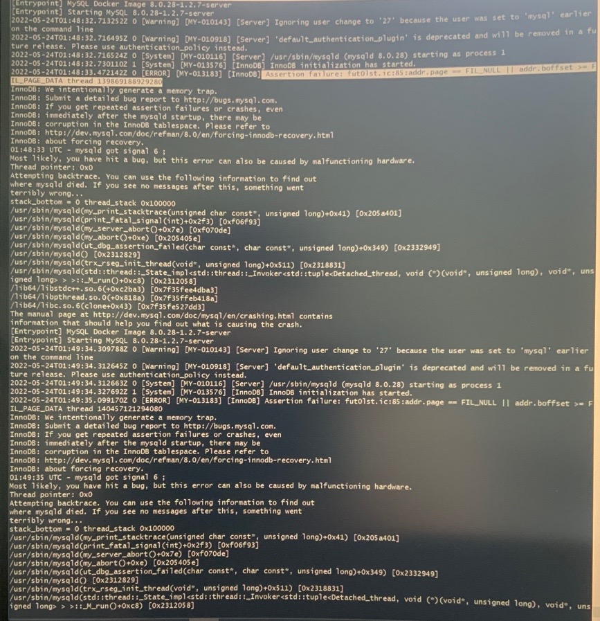 지우고 나니 잠시 뒤 부터 mysql server crash되면서 무한 restart 되기 시작했다. docker-compose ps 로 보니 mysql server status 가 restarting 만 계속 뜬다.