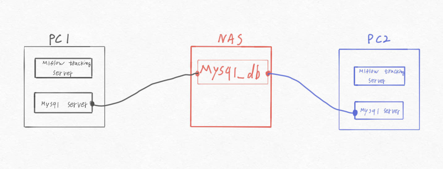 mlflow tracking server 와 mysql server는 각각 docker container 로 instance화해 운영하고 mysql은 mlflow의 backend store로 NAS에 있는 특정 directory를 artifact uri로 사용하고 있었다.
