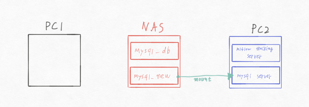 나는 Fig 1. (A) 와 같은 pc1(내 주사용 pc)에 mlflow tracking server, mysql server를 운영 중이었다.