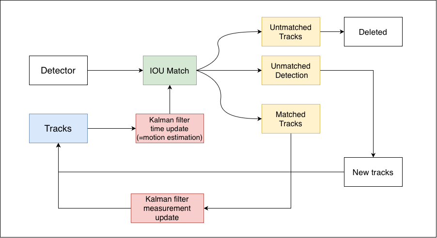 motion estimation을 위해 kalman filter를 사용하고 data association을 위한 정보로 현 프레임에서 detector 가 구한 BBox와 tracking 된 object bbox 사이의 IOU 를 사용한다.