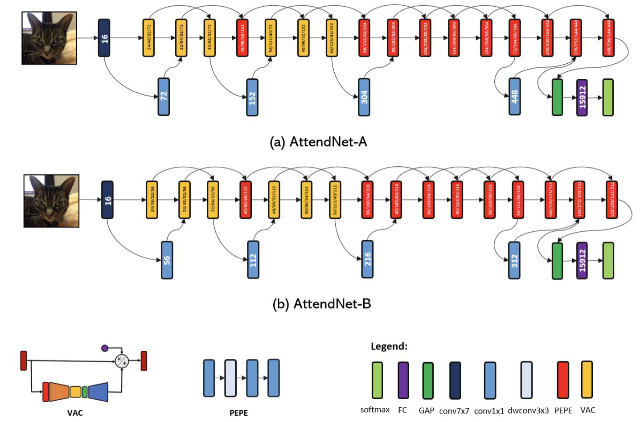 AttendNet-A와 B에서 공통적으로 보이는 특징은 VAC(visual attention condenser)모듈이 모델의 초반부에 집중적으로 사용되고 PEPE(projection-expansion-projection-expansion)모듈이 모델 후반부에 집중적으로 사용된다는 것이다.