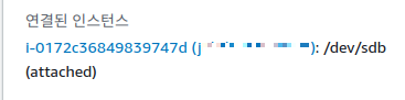 ec2-> 볼륨 정보에 들어가서 생성한 볼륨 정보를 보니 아래와 같이 '/dev/sdb' 라는 볼륨이 있는 것을 확인 할수 있다.