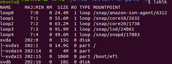 lsblk 라는 명령으로도 볼륨 정보를 확인 할수 있다. 결과는 아래 처럼 나온다. (아래 결과는 내가 /xvda, /xvdb 봄륨의 용량을 각각 15GB, 10GB 로 수정 한 후의 결과이다.)