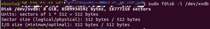 /dev/xvdb 에 대한 정보를 위해 fdisk 를 이용해 아래와 같이 8GB 가 할당된 볼륨임을 확인했다.