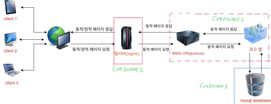 즉 nginx,, django app, db server 를 각각 하나의 컨테이너로 분리해 아래 그림과 같이 container 1, container 2, container 3 으로 나누어 운영하는 것이다.