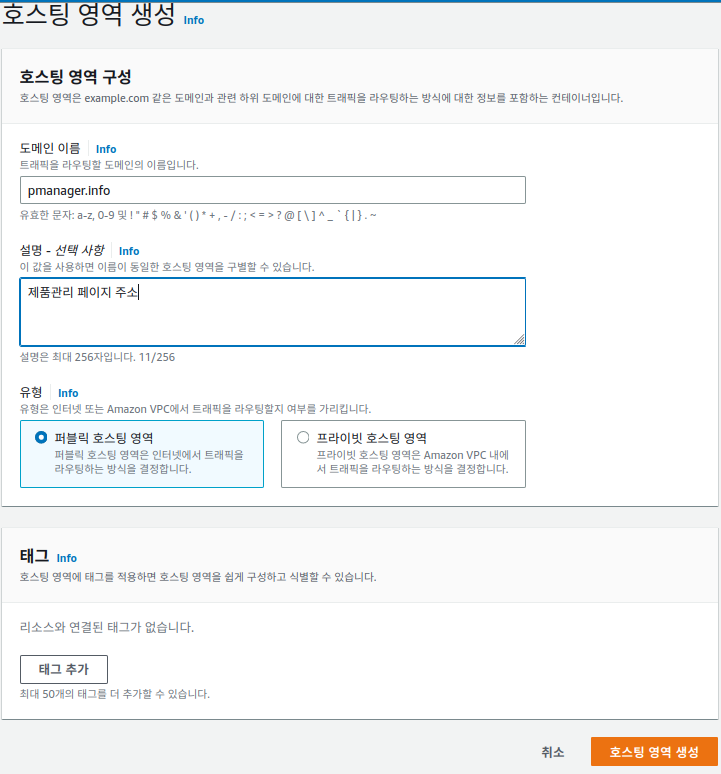 호스팅 영역을 생성 할때 설정해야 하는 값은 1. 도메인 이름, 2. 유형, 3. 태그 이다.