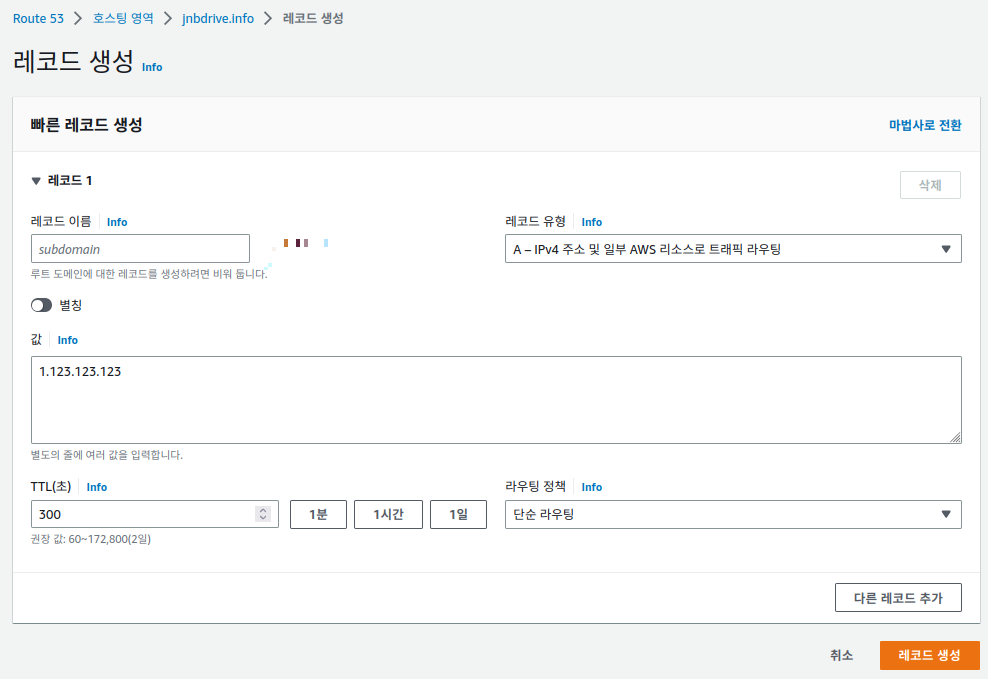 레코드 생성을 누르고 아래와 같은 화면이 나타나면 "값"을 입력하는 란에 이 도메인을 연결한 ec2 인스턴스의 ip를 입력하면 된다.