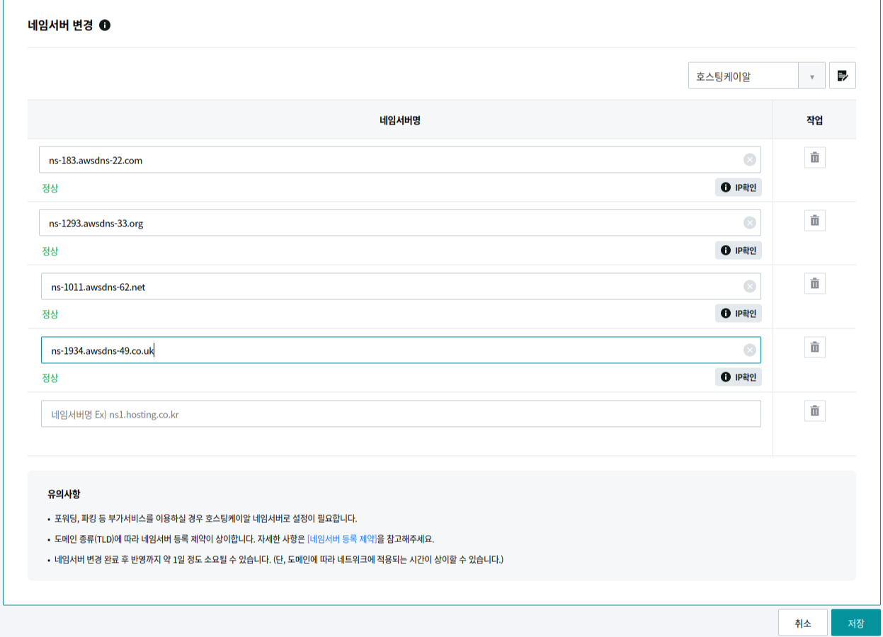 레코드 생성 까지 했으면 이제 도메인을 구입했던 업체의 홈페이지로 접속해 네임서버를 변경해야 한다. 도메인을 구입하면 각 업체에서 해당 도메인으로 트래픽을 어떻게 처리 할지 쿼리할 네임버서를 자동으로 몇가지 설정하게 된다.