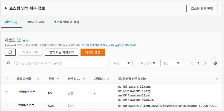 호스팅 영역을 생성하고 나면 다음과 같은 레코드 정보를 볼 수 있다.