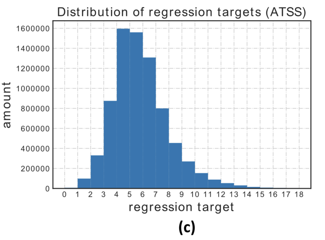 여기서 당연한 의문이 생길 수 있는데 “확률 분포는 그렇다 치고 $P(y)$ 를 구해서 기대값은 구하려면 $y$를 당연히 알아야 하는데 이건 어떻게 구했나?” 가 그 의문이다. 논문의 저자들은 coco trainval135k 데이터 셋에서 bbox regression target $l,t,r,b$의 histogram을 구했다. 그 결과가 아래 histogram 이다. 이를 보면 x축인 regression target이 약 1~16까지 분포해 있는 것을 알 수 있다. 이 정보에 기반해 $ y \in [0,1,2,3,4,5,6,7,8,9,10,11,12,13,14,15,16]$ 으로 미리 정해 놓고 각 $y_{i}$가 현 anchor에 대응 하는 각 변까지의 거리일 확률 분포 $P(y_{i})$를 추론 하도록 했다.