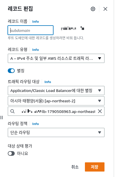 "route53 콘솔 -> 호스팅 영역 선택 -> 유형이 A인 레코드 선택 -> 레코드 편집 클릭"