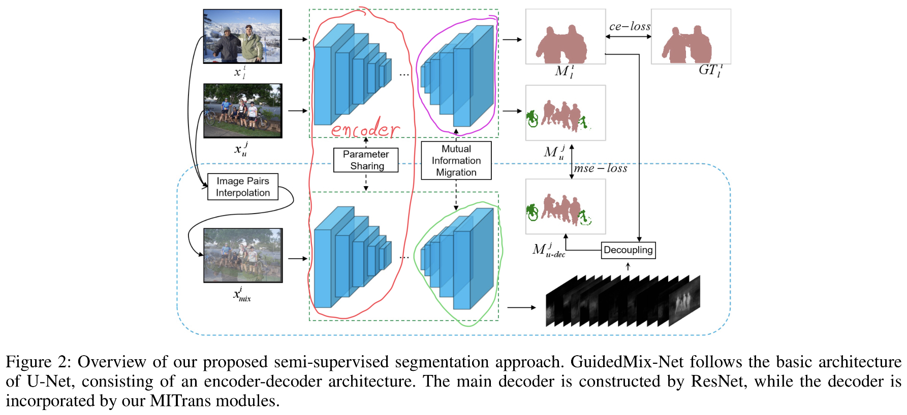 GuidedMix-Net에서는 labeled data 의 정보를 unlabeled data 에 전달해 학습을 guide 하는 방법을 제안하고 이를 mutual information transfer 라 하고 전체 아키텍쳐는 아래 그림과 같다. (우선 이 그림엔 틀린 부분이 있는것으로 보이는데 official code 를 보면 parameter sharing 이 되는 부분은 Figure 2 의 붉은 색으로 표시된 encoder 부분만 이다. decoder 는 labeled data만 이용해 학습 하는 decoder 와 mix input을 이용해 학습하는 decoder가 서로 다르다.)