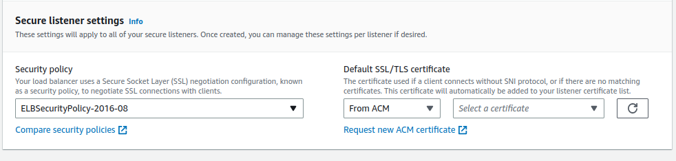 application load balancer 의 생성단계는 거의 다 되었다. 443 번 포트로 들어오는 https 요청에 대한 listener를 등록 하면 아래와 같이 "Secure listener settings" 이라는 추가 설정 섹션이 생긴다. SSL 통신을 위한 certification 을 선택하라는 것인데 "ACM(amazon certificate manager) 에서 SSL 인증서 발급 및 호스팅 영역에 레코드 등록" 에서 생성한 인증서를 선택하면 된다. 이렇게 설정 하면 application load balancer 가 SSL 통신의 종단점 역할을 수행 할 수 있다. 인증서 선택 말고도 왼쪽에 "SEcurity policy"를 선택하는 란이 있는데 나는 이에 대한 지식이 부족해 일단 default 로 두었다.