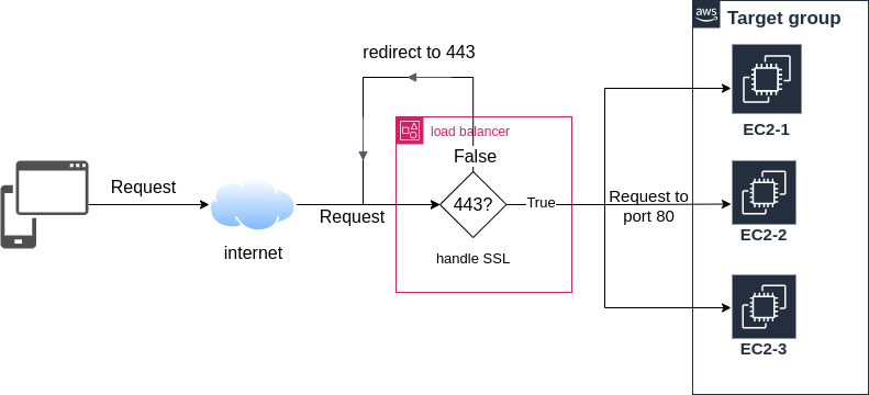 이 구조를 간단히 설명 하면 서버로 request 가 들어오면 load balancer는 요청이 https(port 443) 요청인지 확인한다. 만약 http(port 80) 요청이면 load balancer 가 이 요청을 https 로 redirection 한다. https 요청이면 load balancer 가 SSL session 의 종단점 역할을 대신해 요청을 decryption 해 target group 의 80 번 포트로 요청을 forwarding 한다. 이렇게 구성 하면 ec2 인스턴스에서 실행 중인 server가 ssl decryption 을 수행 하지 않아도 되니 조금더 가벼워 질수 있다.