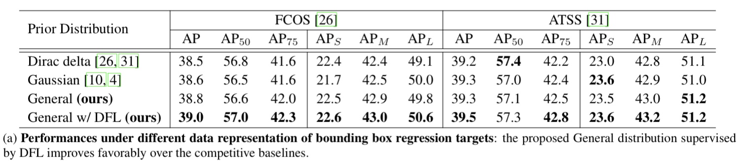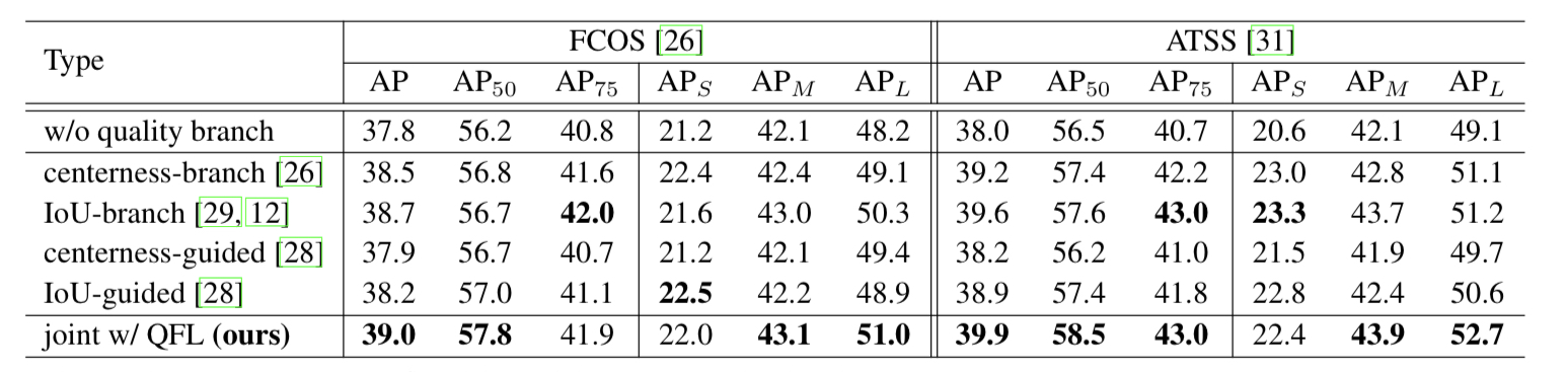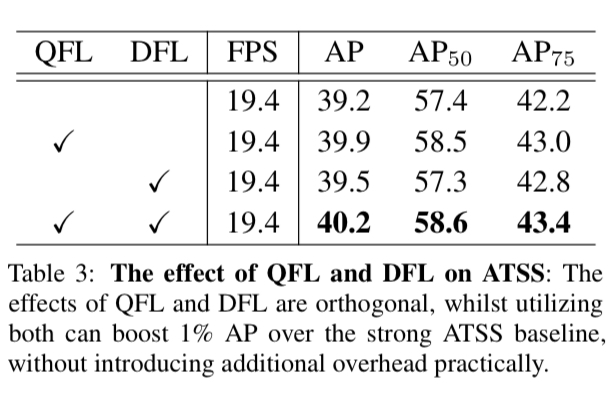 이 논문에서 제안한 QFL, DFL의 효과에 대한 결과 이다. DFL보다는 QFL이 더 직접적으로 AP 향상에 영향을 미치는 것 처럼 보인다. QFL 만 적용 했을때가 DFL만 적용 했을때 보다 AP 컷다. 둘 모두 사용 하면 둘중 하나만 썻을 때 보다 AP 것을 알 수 있다.