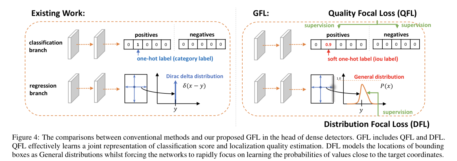 여기서 localization quality estimation과 classification score를 혼합하면 왜 one-hot category label 이 아니라 soften된 label 이 target이 되는지 의문이 들 수 있다. 나도 처음엔 이게 의문이었다. 이유는 classification score(one-hot)에 각 positive sample의 위치 anchor(또는 center position)에 해당하는 pixel에서 추론된 predicted bbox와 target bbox의 IoU score를 곱해서 target으로 사용 하기 때문이다. (one-hot label에서 positive sample의 label은 1이니까 IoU score곱한다는 의미는 IoUscore를 target label로 사용하겠다는 것과 같다). 이게 위 Figure 4의 existing work 과 GFL의 차이에서 label이 soften된다고 나타낸 이유이다.