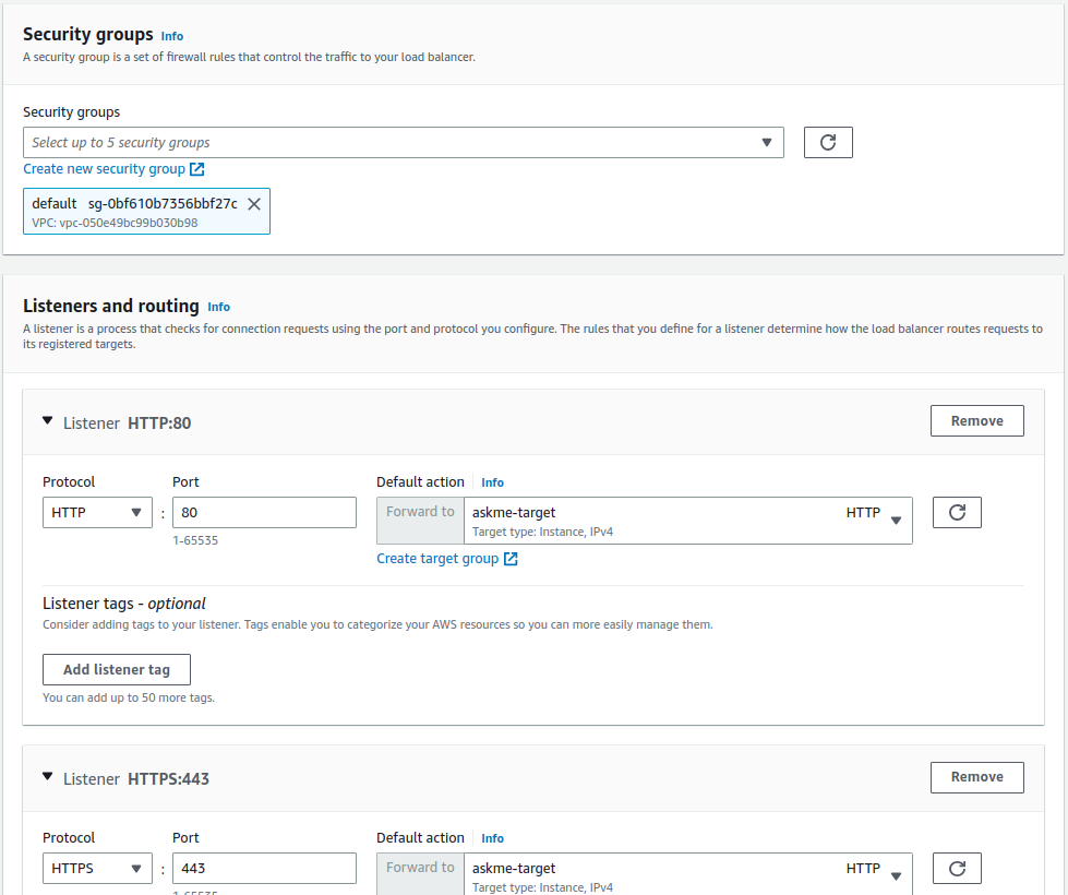 다음으로 Fig 8 처럼 security groups과 listener 정책을 설정한다. Security group(보안그룹)은 임의의 protocol과 port로의 요청을 어떻게 처리 할것인지 에 대한 규정을 담고 있다. ec2 인스턴스와 동일한 정책을 사용하기 위해서는 ec2 인스턴스에 할당한 보안그룹을 선택해도 된다. 나는 target group에 속한 ec2 인스턴스와는 다른 보안정책을 설정 하기 위해 default로 두었다.