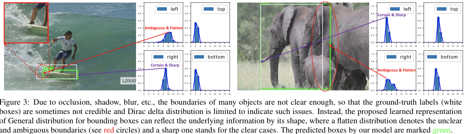 위 Figure 3에서 보면 이 논문에서 제안하는 방식으로 bbox 표현을 학습 하면 가림, 그림자, 흐림 등의 경우에도 target 물체의 모양을 고려해 더 fit한 bbox를 추측 할 수 있다는 것을 나타낸다. 왼쪽 그림의 경우 서핑 보드가 파도에 의해 가림이 생겼는데 이 논문에서 제안한 방식으로 학습한 경우 녹색과 같이 박스가 추측 된다. 이미지 오른 쪽의 그래프는 아직 이해 하지 못해도 된다. 이것 distribution focal loss파트를 읽어 보면 이해 되는 그래프이다.