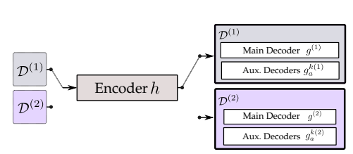 이 두 도메인 데이터를 이용해 학습하는데 encoder $h$ 는 공유 하고 각 도메인의 main decoder과 auxiliary decoder를 따로 따로 사용해 학습을 진행한다. 이렇게 하면 두 도메인의 데이터를 모두 이용해 encoder 가 특정 object의 representation 을 학습하는데 도움이 된다고 한다.