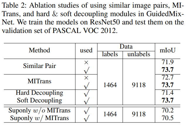 마지막으로 labeled-unlabeled image pair 를 이용해 생성한 $x_{mix}$ 를 MITrans 에 통과 시킨후 decoder 를 통해 생성한 segmentation mask 는 labeled image에 존재하는 object에 해당하는 부분이 존재한다.