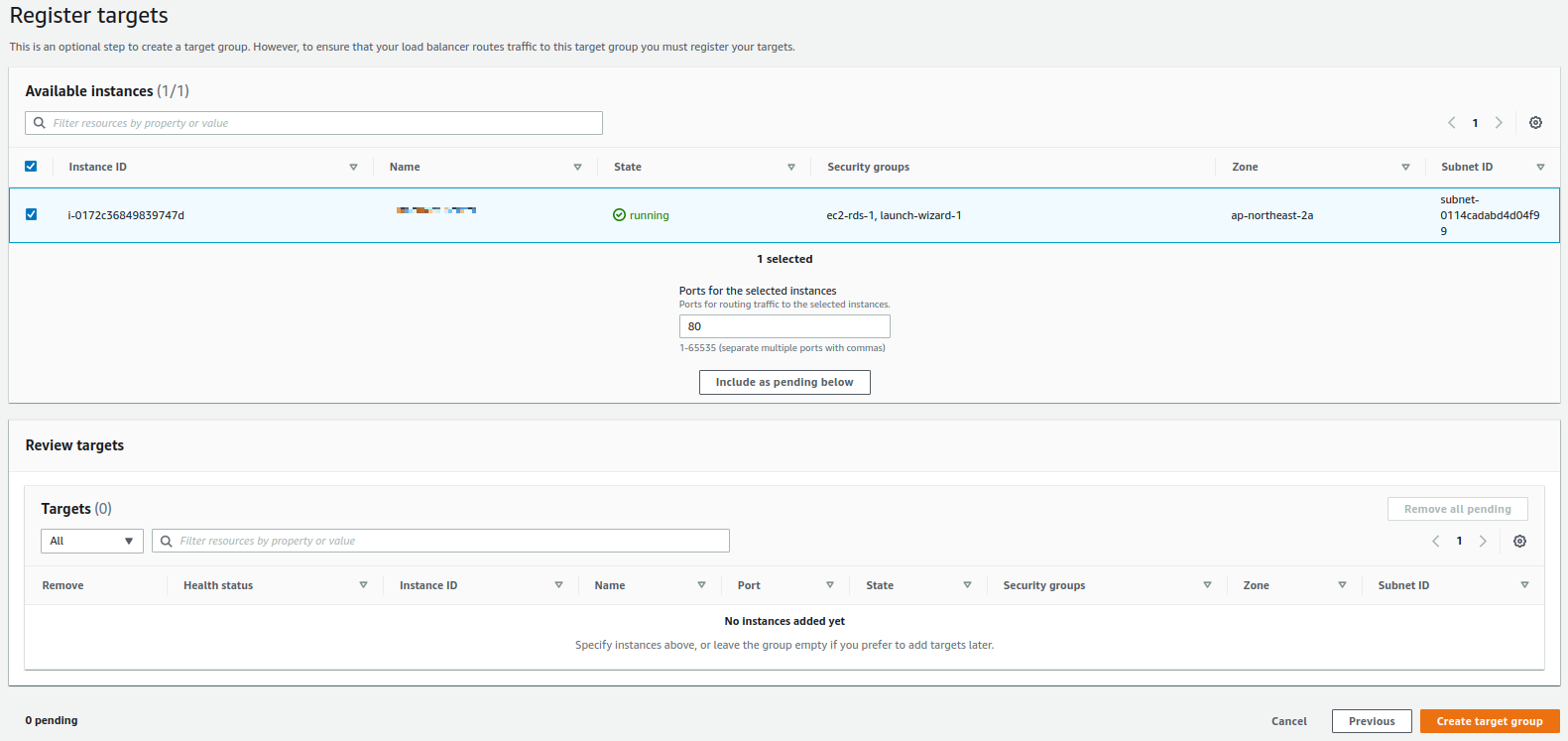 생성을 클릭하고 나면 다음과 같은 페이지가 보인다. 이 과정이 실질적으로 방금 만든 target group에 요청을 처리할ec2 인스턴스를 추가하는 과정이다. 추가하고자 하는 ec2 인스턴스를 선택하고 해당 인스턴스의 어떤 port로 요청을 routing 할지 정하고 "Include as pending"을 클릭하면 된다.