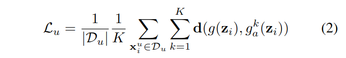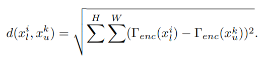 이때 랜덤으로 labeled-unlabeled image pair를 선택하는 것보다 유사 이미지를 선택하는 것이 더 효과적이라고 하는데 그 이유는 동일/유사한 object 를 포함한 두 이미지가 섞여야 labeled image 로 부터의 정보가 unlabeled image 로 전파 더 잘 전파 될 수 있기 때문이다. 유사 이미지를 선택하는 방법은 mini batch 내에서 encoder의 output 으로부터 계산한 euclidean distance 가 가장 작은 labeled-unlabaled image 쌍을 선택하는 것이다. 아래 식에서 $\Gamma$ 는 model의 encoder 를 의미한다.