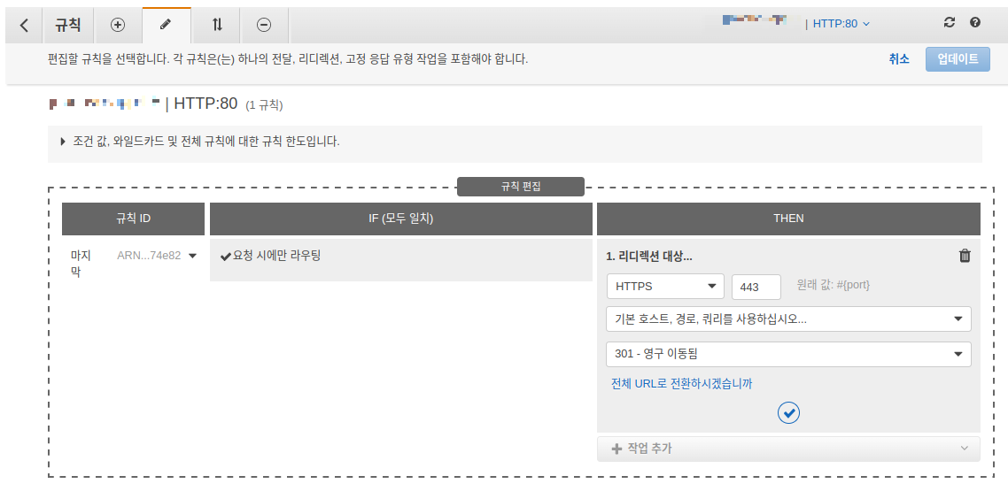 리스너 상세 페이지에서 우상단에 있는 manage ruls를 클릭한다. 아래 Fig 11 처럼 80번 포트에 대한 규칙을 리디렉션으로 바꾸고 대상을 HTTPS 로 하고 저장한다. 이렇게 설정 하면 80번 포트로 오는 요청을 443 번의 HTTPS 로 리디렉션 하게 된다.