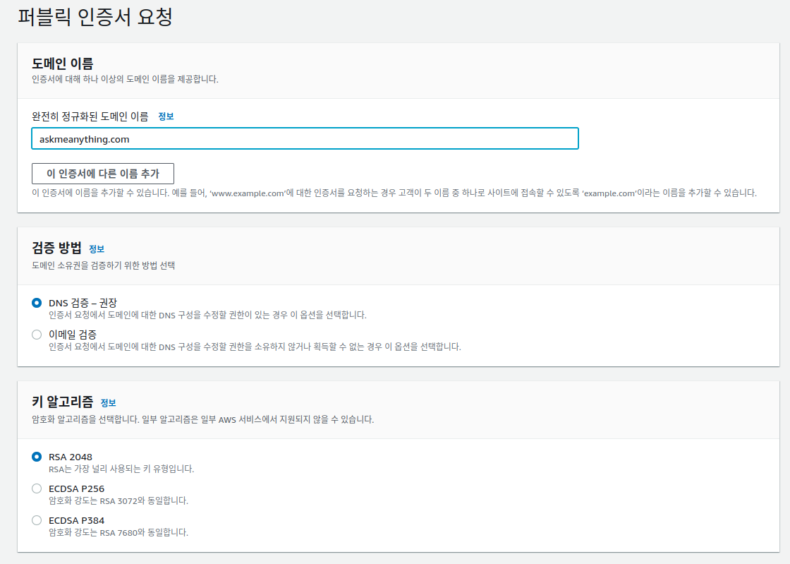 다음과 같은 화면 이 나오는데 도메인 이름에는 ssl을 이용해 통신을 암호화 하고자 하는 domain 을 입력한다. 예를 들어 내 웹페이지의 주소가 askmeanything.com 이라 하면 이 주소를 입력하면 된다. 검증 방법은 DNS 와 이메일 검증이 있는데 DNS 검증을 추천한다. 다만 DNS 인증을 이용하기 위해서는 askmeanything.com 이 DNS 서버에 등록이 되어있어야 한다. DNS 서버에 domain 을 등록 하는 방법은 [aws]ec2 인스턴스 도메인 연결을 참조하자.