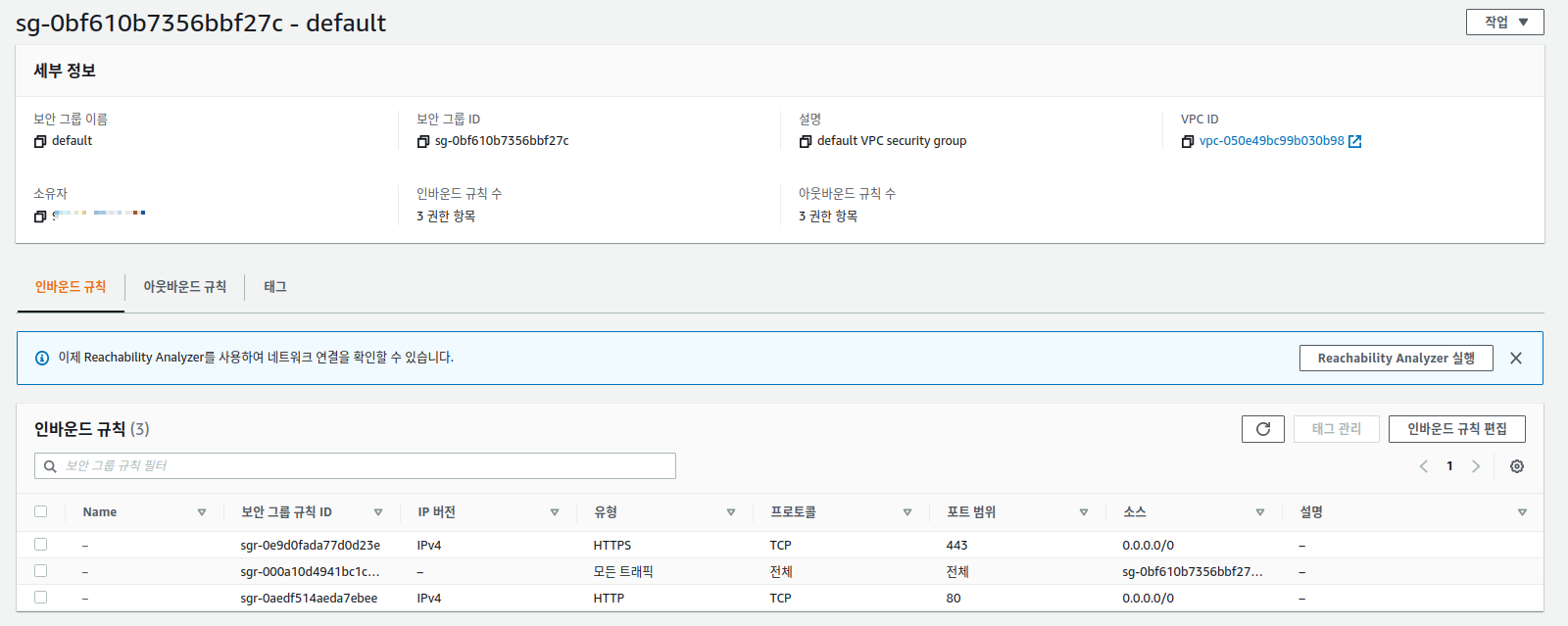 80번 포트의 소스가 위 Fig 12 에 나온 로드 밸런서 보안 규칙의 식별자임에 주의를 기울이자. 이렇게 설정하면 이 ec2 인스턴스는 로드밸런서를 통해서 80번 포트로 들어오는 요청만 받아서 처리하게된다. 아래 Fig 13에는 80 번 포트 외에 SSH접속을 위해 22 번 포트를 열어 놨는데 이건 어디서든 접근 할 수 있게 0.0.0.0/0 으로 소스를 설정했다.Fig 13. target group 에 속한 ec2 인스턴스의 보안 규칙