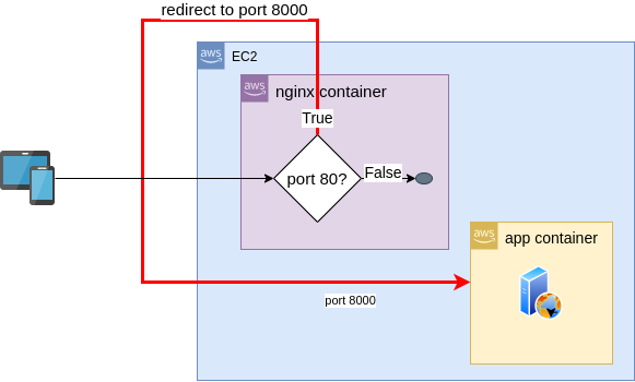 원래의 내 계획은 app server 로의 요청은 반드시 80 번 포트로 들어와 nginx를 거쳐 app server 로 가게 하는 것이었다. 이를 위해 docker network를 이용해 nginx continer 와 app container 사이의 일종의 private network 를 구성했다. 전체 아키텍쳐는 아래 Fig 2 와 같다. Fig 1과 비교해 보면 redirect to port 8000 을 의미 하는 붉은 색 선이 ec2 인스턴스 밖으로 나가지 않고 nginx container 와 app container 사이에 존재 한다. 이렇게 하면 ec2 인스턴스의 보안 그룹에서는 8000port 를 오픈할 필요가 없어 보안 위험을 줄일 수도 있고 계획 대로 80번 포트로 들어오는 요청만 nginx를 거쳐 app server 에 전달하는 것이 가능해 진다.