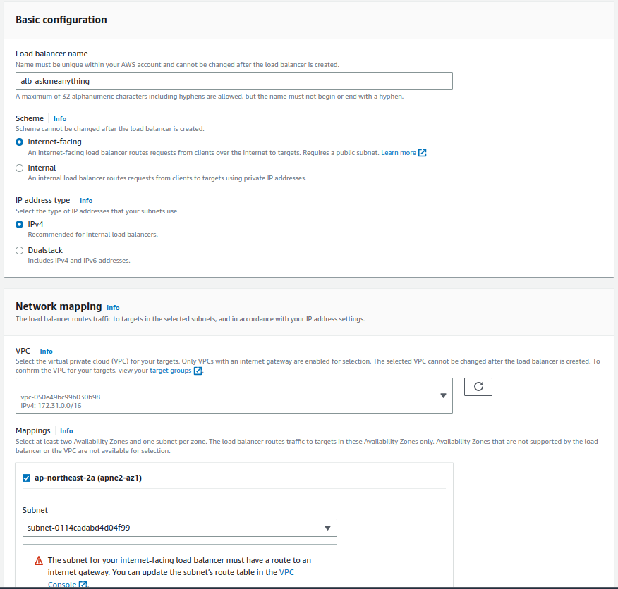 외부에서 들어오는 요청을 받아서 처리하는게 목적이므로 Basic configuration 의 scheme 에서 "internet-facing"을 선택한다. IP address type은 IP4 를 선택했다. 요즘은 IPv6가 많으니 실제 서비스를 위해서는 Dualtask 를 선택하는게 적절할거 같다. (나는 처음엔 IPv4 를 선택했다 나중에 dualstask으로 변경했다.)
