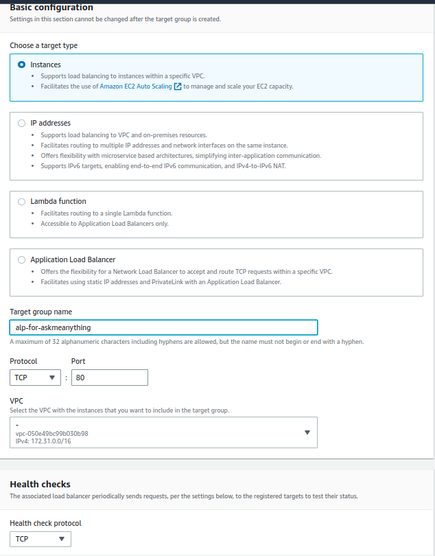 Target group name에는 식별하기 쉬운 이름을 입력하자. 이 이름으로 load balancer 를 만들때 target group을 선택할 것이다. VPC 는 이 target group에 포함 시킬 ec2 인스턴스들이 할당된 VPC와 같은 것으로 선택한다. 이게 다르면 통신이 되지 않는다.