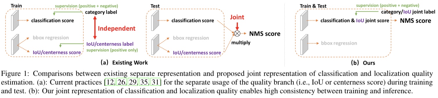 사유 1. FCOS 같은 one stage detector들은 학습시 classification score 와 centerness(또는 iou)score 가 별개로 학습되지만 inference 시에는 nms전에 두 score를 join해서 사용(element wise multiplication)한다. 위 Figure 1의 (a)의 train와 test이 이를 잘 보여준다.