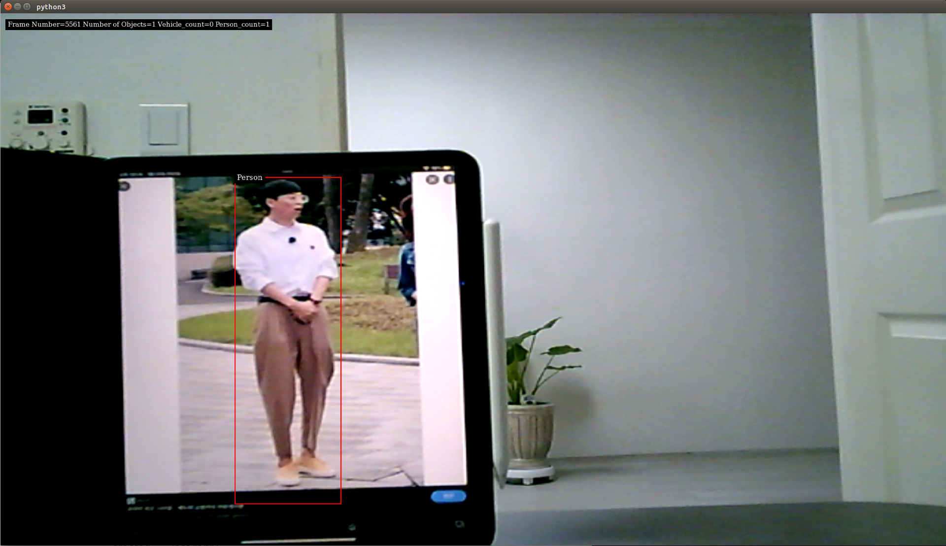 아래는 실행 화면 인다. 아이패드로 유재석 씨 사진을 띄워 카메라 앞에 두니 사람으로 인식하는 모습을 볼 수 있다.