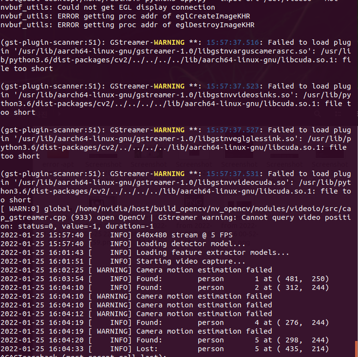 예제를 실행 하고 나면 gstreamer warning이 마구 발생하며 꼭 실행이 안될 것 처럼 log가 나온다.