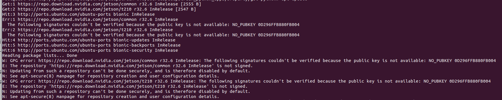W: GPG error: https://repo.download.nvidia.com/jetson/t210 r32.6 InRelease: The following signatures couldn't be verified because the public key is not available: NO_PUBKEY 0D296FFB880FB004