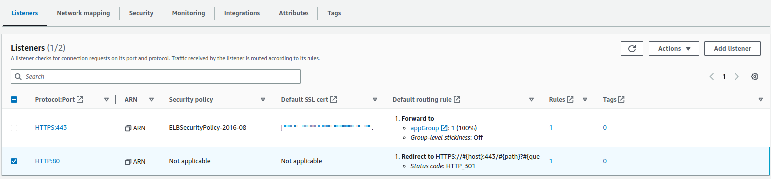 또한 application load balancer를 이용 하면 이 포스트의 목적이었던 암호화된 통신 SSL 을 적용 할 수 있다. Fig 1 에서 처럼 암호화 되지 않은 요청이 application load balancer 로 도착하면 암호화 된 통신을 위해 이 요청을 https(port 443)으로 redirection 한다. 요청이 암호화된 요청이면 application load balancer 가 SSL 연결의 종단점 역할을 수행해 암호화된 요청을 해독하고 해도된 요청(request)를 target group의 80번 포트로 포워딩한다. 이렇게 되면 서비스를 제공하는 서버들은 요청을 해독하는데 자원을 할당하지 않아도 되는 장점(?)이 있다.